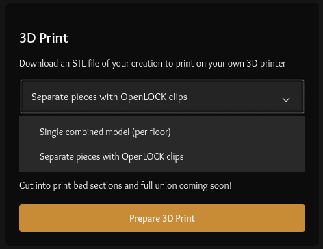 When you are ready to 3D print your model, hit the “3D Print” button in the top right corner and choose either a fully combined STL file for each floor of your building or separate OpenLOCK pieces to build it yourself.