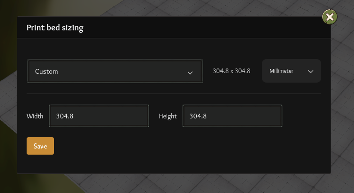 - You can now use inches or millimeters in the Print Bed Sizing menu and we have loaded in some common 3D Printer Presets: