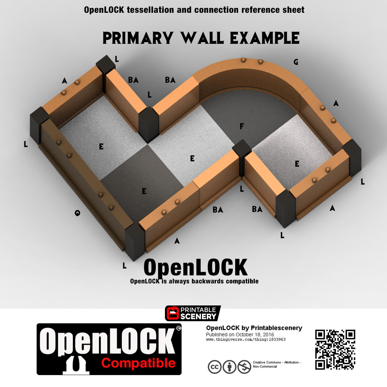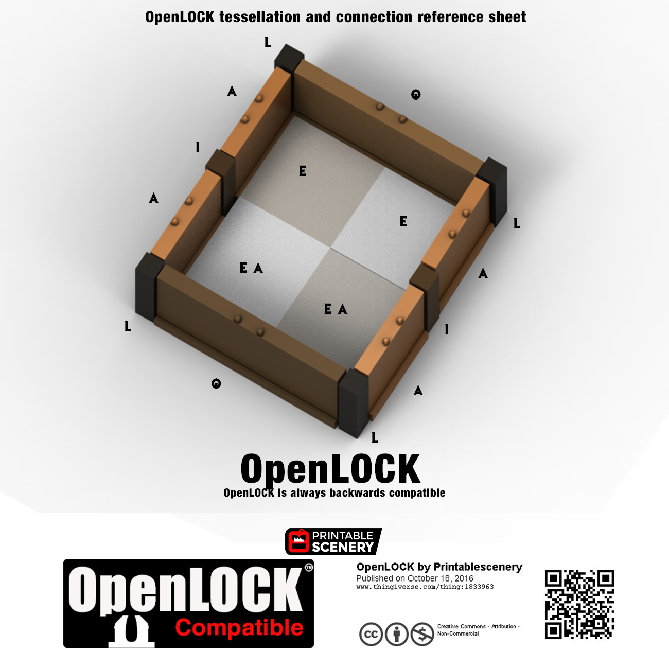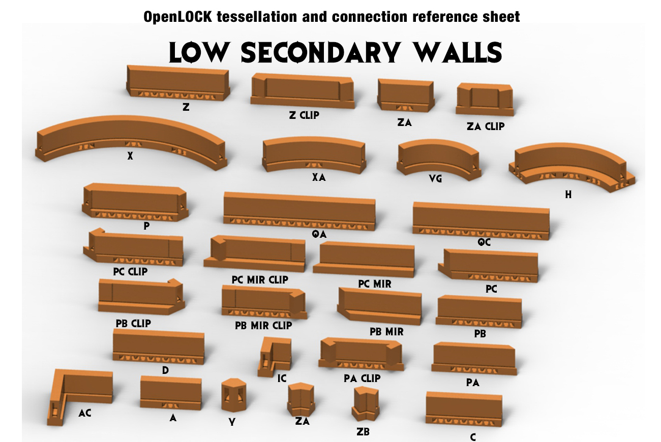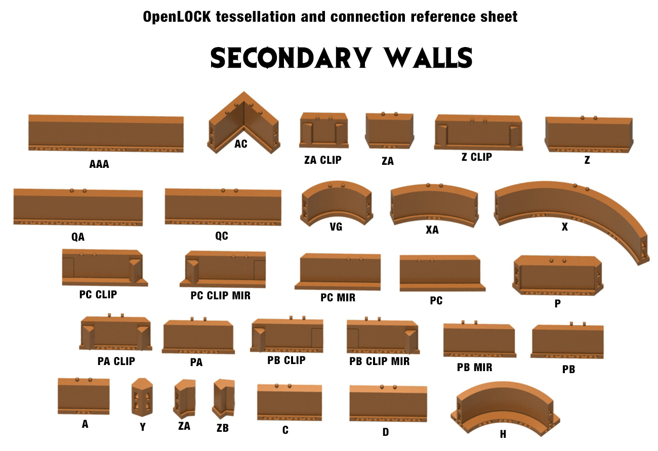 OpenLOCK is an interconnecting tile technology designed by Printable Scenery. The models on TerrainTinker use this and the new OpenLOCK Digital format. Each tile shape has a letter code.