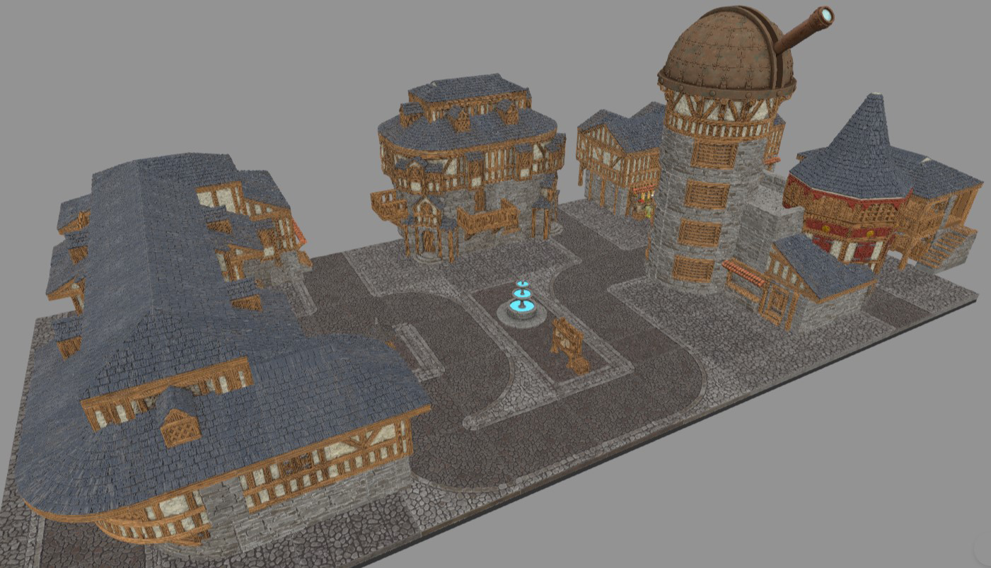 Dungeonwolf has excelled themself with this massive diorama – a complete city section with roads, towers, and houses. There is so much detail crammed into this city block, from bridges crossing over roads, to rows of shops. There are even the libraries of what looks like a wizard’s tower at the center. Clever positioning choices were made in having the whole road section as the bottom level, with the buildings on the second level hovering over their place in the display. As stated by dungeonwolf, this is a model that needs to be printed in groups rather than as individual pieces, as sections do on occasion overlap in order to create a seamless look to the design.